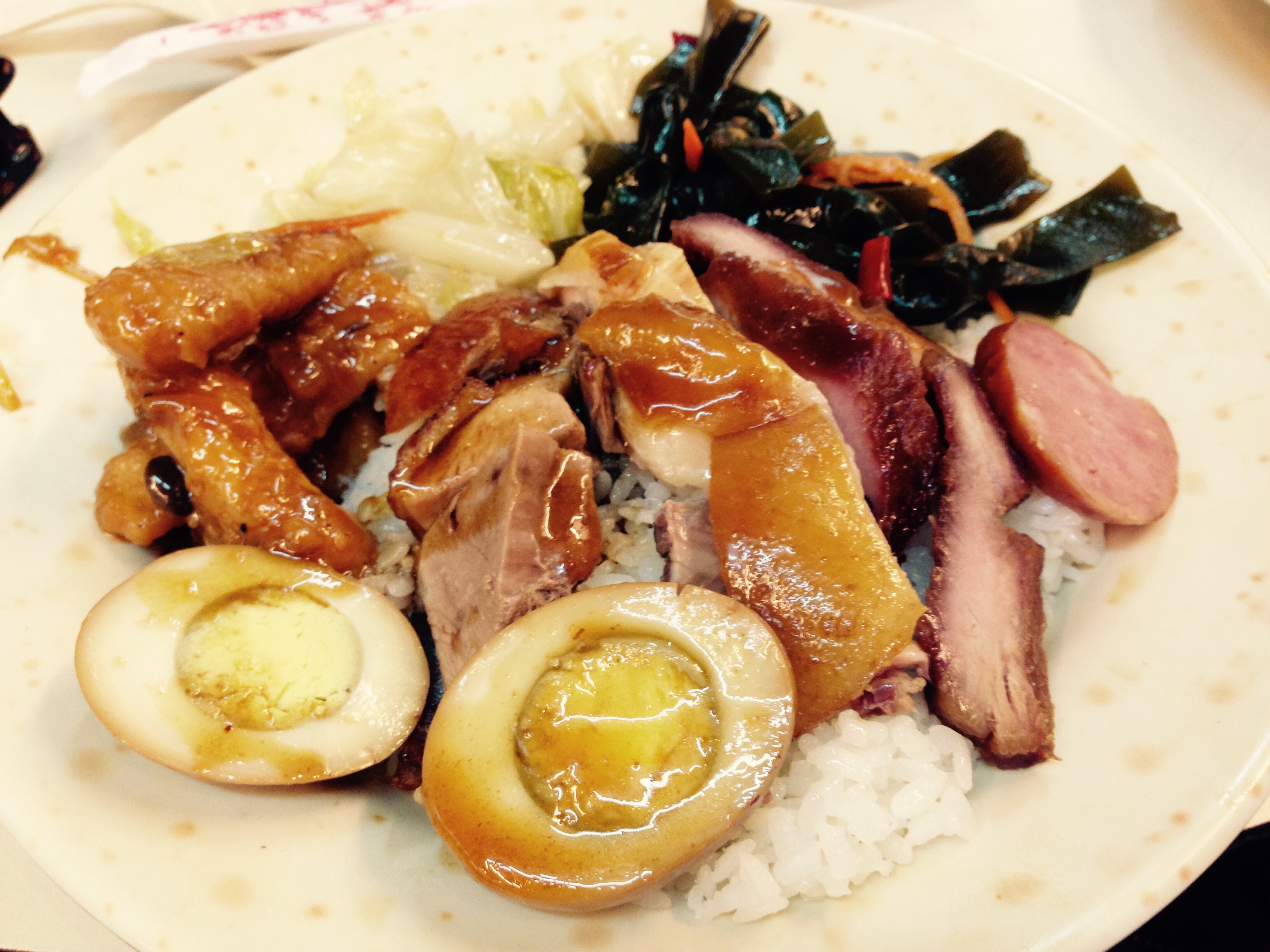 Roasted chicken, duck and pork with rice; served with a side of iron eggs, seaweed and cabbage. Healthy, flavoursome and scrumptious: every yummy bite tasted like it was good for you. I’ve eaten similar things in Singapore, but the Taiwanese flavour profile is quite different to the Singaporean one – despite the fact that we eat so many of the same dishes.