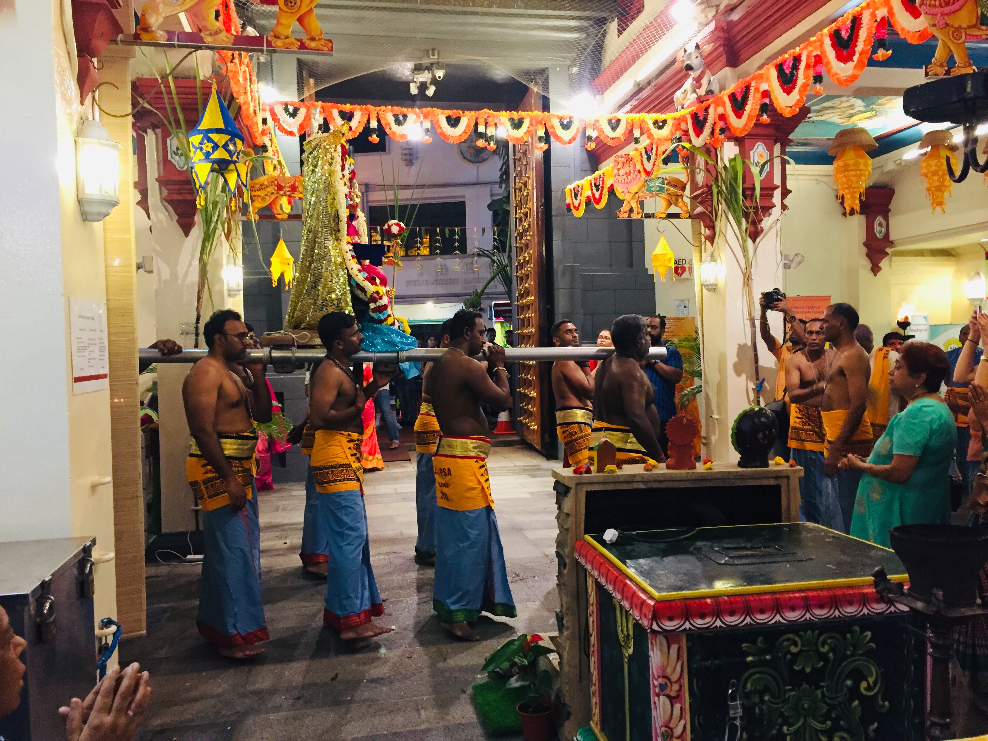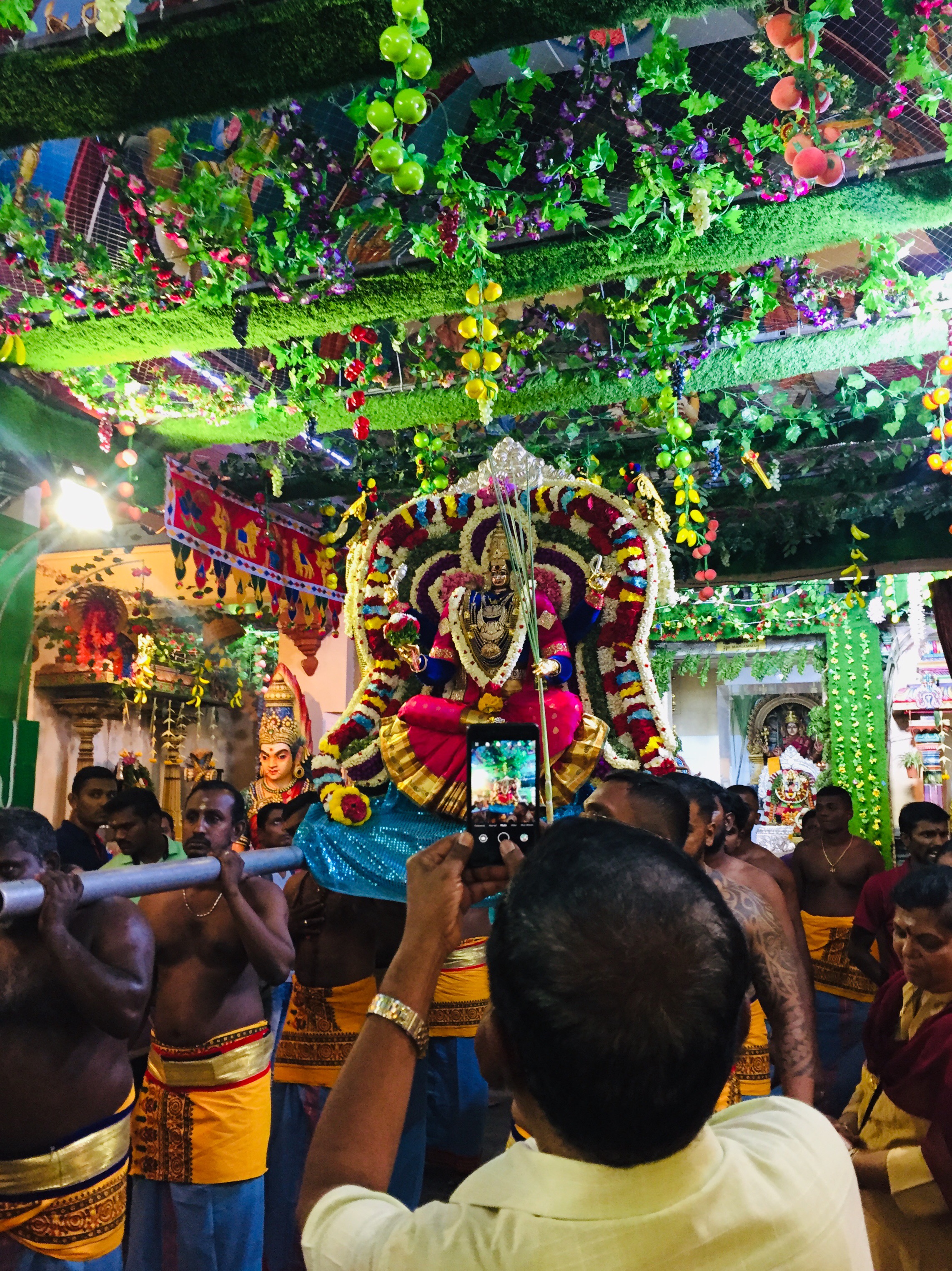 Unlike most female devotees that show up at the temple in their best sarees, I usually head to the temple in a simple blouse and jeans. But even I put in some effort today. I wore my favourite long red dress with a white shawl. I head to Sri Mariamman Temple, continuing a tradition my grandfather started. I’m fairly accustomed to the opening prayers that take place at 6pm everyday… but this was no ordinary day. The procession through the temple had already started by the time I got there.