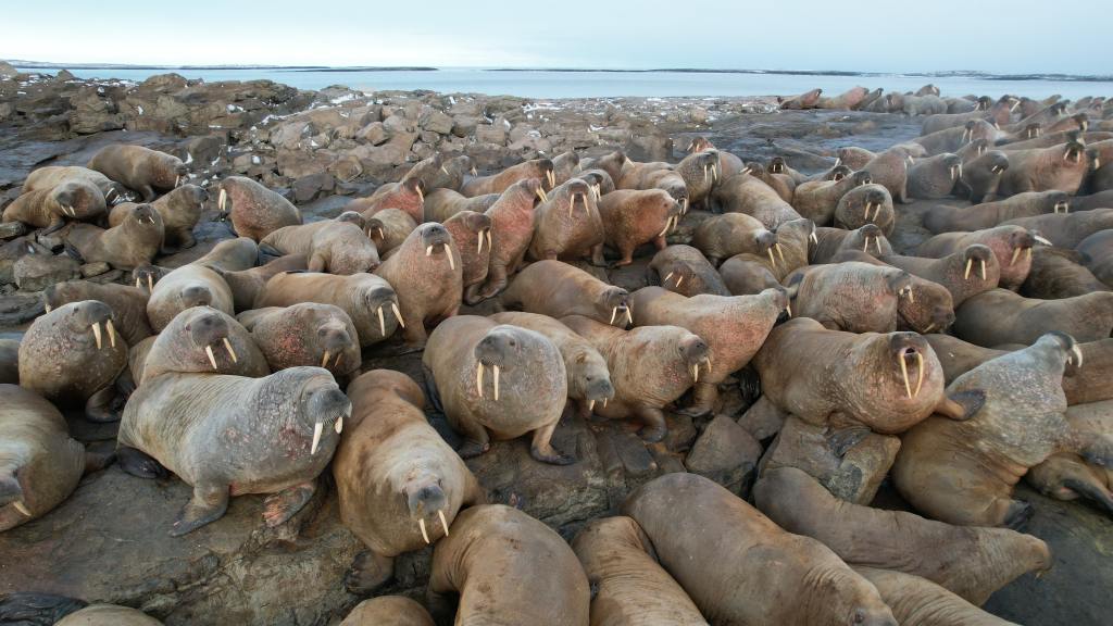 With their wrinkled brown and pink hides, walruses are distinguished from other groups that lounge on the ice by their long white tusks and grizzly whiskers.